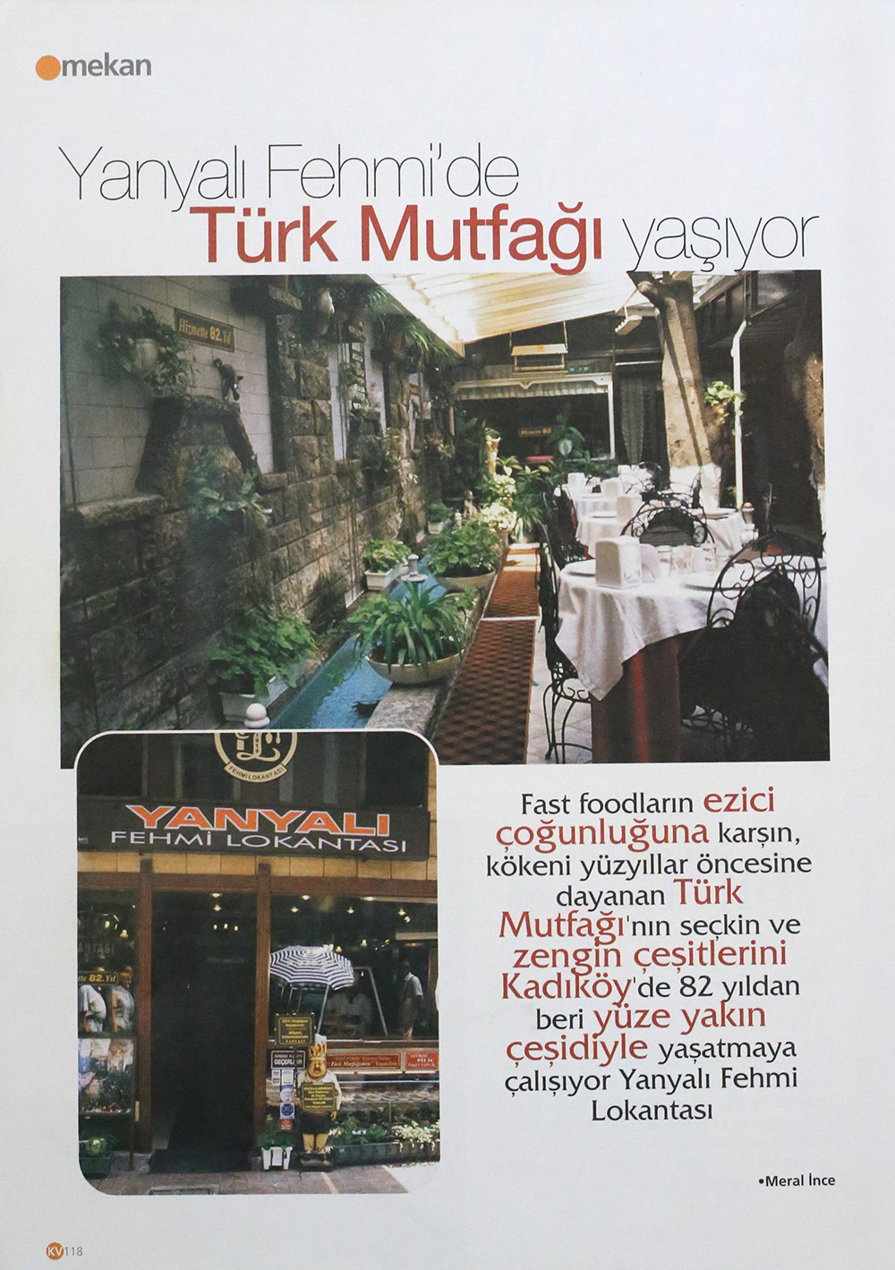 85 yıldır Kadıköy'de Osmanlı saray mutfağının en iyi örneklerini sunan Yanyalı Fehmi Lokantası, üç kuşaktır hizmete devam ediyor. 1919'da saraydan emekli başaş-çı Bolulu Hüseyin Efendi ile lokanta açan Fehmi Efendi, kısa sürede iin yapmış. Dönemin ünlü siyasetçileri, sanatçı ve yazarları lokantanın müdavimi olmuş.