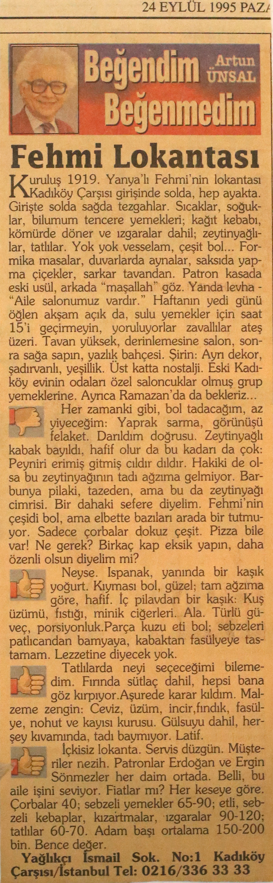 Batı Yunanistan’ın Arnavutluk’a yakın kısmında kumlan Yanya kentinden göçle İstanbul’a gelen Sipahioğlu eşrafından 1891 doğumlu Fehmi Efendi bir süre inşaat işiyle uğraştıktan sonra saray mutfağında çalışıyor. 1919 yılında saraydan ayrılarak Kadıköy’de bir lokanta açıyor. Soyadı devriminde Sönmezler soyadını alan Fehmi Efendi 1981 yılında Kadıköy’de vefat ediyor. Bıraktığı lokantası halen hayatta olan beş çocuğundan Erdoğan ve Engin Sönmezler tarafından baba vasiyetine uygun şekilde işletiliyor.