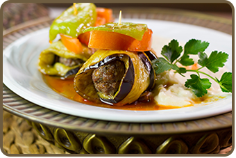 It's one of the most popular Yanya's meals. Specially cooked meatballs wrapped by thin slices of eggpland, and then bake with tomatoes.