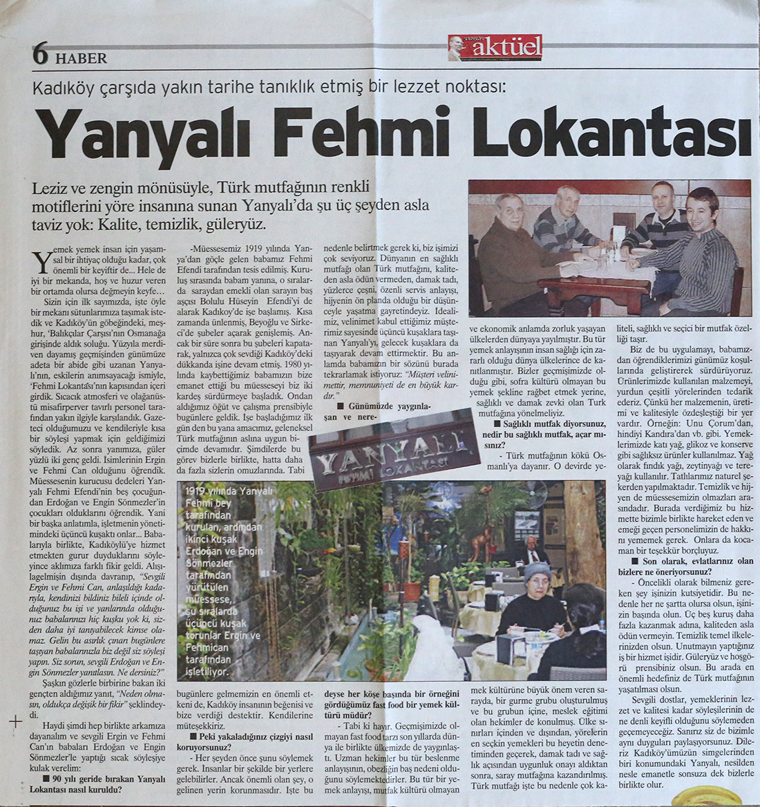 85 yıldır Kadıköy'de Osmanlı saray mutfağının en iyi örneklerini sunan Yanyalı Fehmi Lokantası, üç kuşaktır hizmete devam ediyor. 1919'da saraydan emekli başaş-çı Bolulu Hüseyin Efendi ile lokanta açan Fehmi Efendi, kısa sürede iin yapmış. Dönemin ünlü siyasetçileri, sanatçı ve yazarları lokantanın müdavimi olmuş.